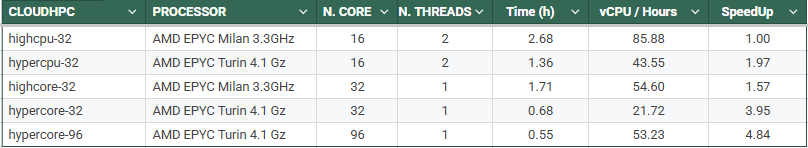 highcpu-32, 32 logical threads) resulted in a run time of 2.68 hours. However, utilizing 32 physical cores without hyperthreading (highcore-32, 32 physical threads) brought down the time to 1.71 hours. Even though the logical core count was similar, the use of more physical cores yielded a significant boost (approx. 57% speedup). - Turin Example: The pattern is even more pronounced with Turin. On 16 physical cores with hyperthreading (